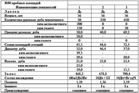 Лесополоса, где в качестве главной породы произрастает дуб черешчатый, шириной 48 м расположена в нижней части балки и играет одновременно роль и полезащитную, и водорегулирующую. В наиболее продуктивной её части заложена пробная площадь. Результаты исследований на стационарах даны в таблице 2.