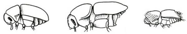 Лубоїди мають закруглено-загнуті донизу надкрила і майже горизонтальне черевце. Якщо ж черевце косо піднімається до надкрил, то вони поступово опускаються до вершини черевця; голова зверху трохи виділяється з передньоспинки (рис. 1.1 (1) ).