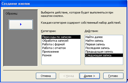 Форма «Перевозка» является центральной, при помощи кнопок из нее можно попасть в остальные формы: «Водители» и «Новый_объект». С их же помощью осуществляется и навигация по записям формы. Для создания кнопки используется соответствующий элемент на панели инструментов, затем указывалось действие, которое должно происходить при нажатии создаваемой кнопки. Этот процесс отображен на рис. 6.