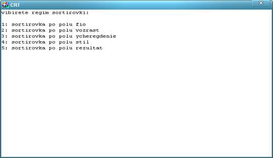 5) procedure sortirovka – процедура сортировки. Позволяет отсортировать нужное поле по возрастанию. Перед нами появляется меню в котором мы можем выбрать необходимое поле для сортировки.