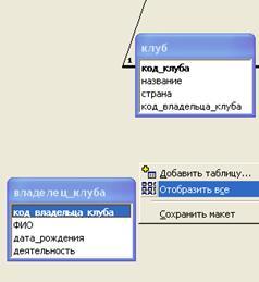 Чтобы увидеть полученную связь, необходимо в любом месте поля «Схемы данных» щелкнуть правой кнопкой мыши, выбрать команду «Отобразить все» (рис.9), после чего появится созданная связь (рис.10)