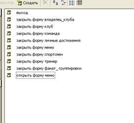 В процессе проектирования базы данных «Спортивный клуб» были созданы макросы, обеспечивающие закрытие каждой формы; макрос, обеспечивающий выход из приложения MicrosoftOfficeAccess;