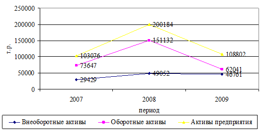 Валюта баланса за анализируемый период (2007-2009 гг.) существенно не изменилась. Сначала, в 2008г. произошел рост на 97108 т.р., а в 2009г. уменьшение на 91382 т.р., что является отрицательной тенденций деятельности предприятия. В целом, за анализируемый период ее рост составил 5726 тыс. руб.