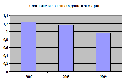 Чем более развит экспортный сектор национальной экономики, тем больше у России возможностей выполнять имеющиеся долговые обязательства перед внешними кредиторами. Мировой банк использует этот показатель в качестве одного из критериев - для классификации стран-дебиторов по группам: критическим уровнем считается превышение суммой долга 220% экспорта, умеренным - менее 220%, но выше 132%, небольшим - менее 132 процентов. Динамика 2007-2009 гг. говорит о том что экспорт страны постоянно растет (уменьшение показателя), таким образом, положение Российской Федерации не является критическим. (рисунок 3)