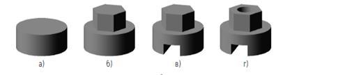 Рис 9.1 Булевы операции над объемными элементами: а)цилиндр, б)объединение цилиндра и призмы, в)вычитание призмы, г) вычитание цилиндра