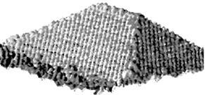 В гетеросистемах Ge-Si экспериментально наблюдают несколько стадий эволюции островков в процессе увеличения эффективной толщины пленки. Эти стадии различны для подложек с ориентацией поверхности (001) и (111). С точки зрения создания квантовых объектов поверхность (001) является уникальной, потому что только на ней были обнаружены компактные трехмерные бездислокационные островки размером 10 - 100 нм. Появление таких островков наблюдается после образования сплошной пленки Ge. Начало образования 3D кластеров сопровождается возникновением на картинах дифракции быстрых электронов (ДБЭ) объемных рефлексов и отходящих от них тяжей, сформированных рассеянием электронов на гранях {105}. Благодаря своей форме такие островки получили название "hut" - кластеры []. На рис.3 представлено изображение "hut" кластера полученное Lagally [] с помощью туннельной микроскопии.