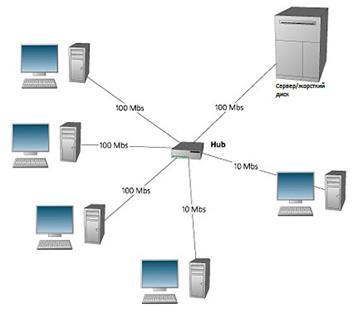 Топологія «Зірка» передбачає підключення кожного комп'ютера окремим проводом до окремого порту пристрою, званого концентратором або повторювачем, або хабом (див. рис. 2.2).