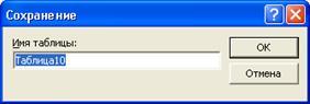 В окне Сохранение (Save As) в поле Имя таблицы (Table Name) ввести имя новой таблицы и нажать кнопку ОК .