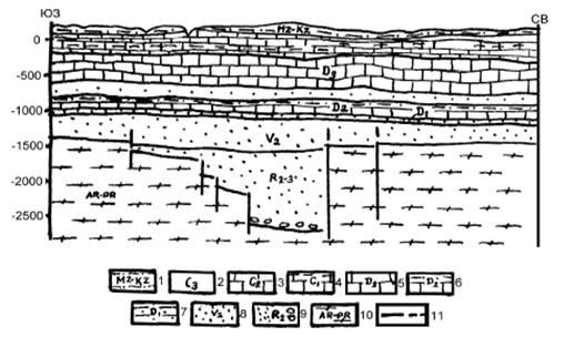 1 – мезокайнозойские отложения; 2 – верхнекаменноугольные отложения; 3 – среднекаменноугольные отложения; 4 – нижнекаменноугольные отложения; 5 – верхнедевонские отложения; 6 – среднедевонские отложения; 7 – нижнедевонские отложения; 8 – вендские отложения, 9 – рифейские отложения; 10 – кристаллические породы архейпротерозойского возраста, 11 – глубинные разломы