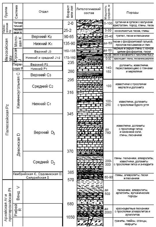 В основании осадочной толщи, слагающей синеклизу, залегают породы рифейского и вендского отделов верхнего протерозоя (рис. 2) Они представлены песчаниками, конгломератами, алевритами, аргиллитами и глинами с прослоями вулканогенных пород - туфов и туффитов. Органические остатки в них встречаются крайне редко. Эти отложения образовывались при разрушении горно-складчатых сооружений фундамента и накапливались преимущественно в прогибах, где их мощность достигает иногда 2500 м. На разделяющих эти прогибы выступах мощность рифейвендских отложений не превышает первых сотен метров, а порой они отсутствуют вовсе.