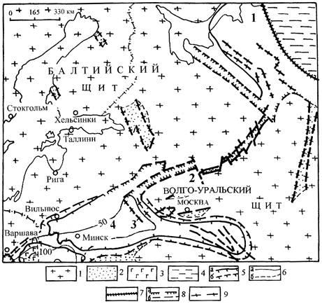 Рис. 4. Палеотектоническая карта центра Восточно-Европейской платформы. Позднебайкальский этап. Волынская (ранневендская) фаза. 1 – фундамент платформы на поверхности; 2 – области, ранее перекрытые чехлом; 3 – трапповое плато на поверхности; 4 – области субконтинентальной либо океанской коры; 5 – контуры развития волынских образований (а – современные, б – первоначальные предполагаемые); 6 – палеоизопахиты волынских образований, м (а – достоверные, б – восстановленные на площадях постседиментационных размывов); разломы, проникающие в чехол: 7 – краевой шов платформы, 8 – синхронные процессу седиментации (а – сбросового, б – сдвигового характера), 9 – не выходящие на поверхность. Структуры: 1 – Скандинавско-Уральская зона перикратонных опусканий, 2 – Среднерусский авлакоген, 3 – Смоленско-Рязанский прогиб, 4 – Кобринско-Могилевский прогиб.