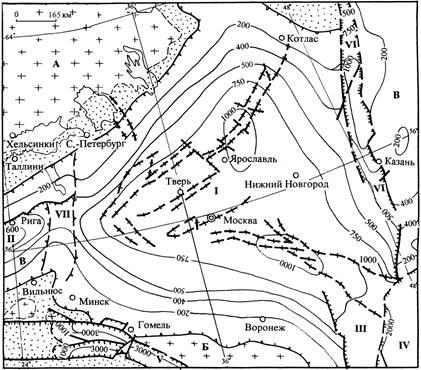 Московская синеклиза расположена центре ВЕП, имеет размеры 800х800 км и фиксируется главным образом по контуру развития верхневендских образований. Строение депрессии демонстрируют структурные карты опорных поверхностей различных срезов чехла и фундамента. Подошвой синеклизного мегакомплекса депрессии служит в большинстве регионов поверхность фундамента (см. рис. 3), а в зоне развития ранних палеорифтов – кровля нижнебайкальского или дальсландского комплексов, выполняющих рифтовые структуры.