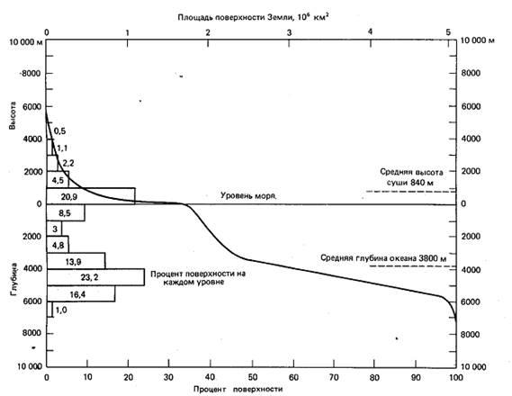 Общее представление о распределении земной поверхности по ступеням высот и глубин дает гипсографическая кривая. По способу построения это кумулятивный график распределения высот и глубин.