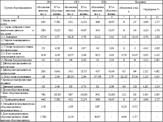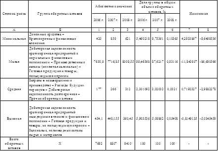 Как видно из расчетов, представленных в таблице 3, наибольший удельный вес в составе оборотных активов предприятия занимают запасы. Однако в динамике их удельный вес сокращается. Так на начало исследуемого периода их доля составляла 58 %, а к концу 2008 года – 49,6 %.