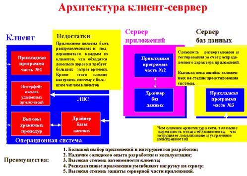 Однако при этом частые обращения клиента к серверу снижают производительность работы сети, кроме этого приходится решать вопросы безопасной работы в сети, так как приложения и данные распределены между различными клиентами. Распределенный характер построения системы обуславливает сложность ее настройки и сопровождения. Чем сложнее структура сети, построенной по архитектуре КЛИЕНТ-СЕРВЕР, тем выше вероятность отказа любого из ее компонентов.