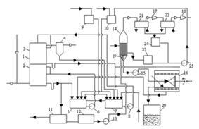1 - паровий підігрівач; 2 - сатуратор; 3 - кислотна ловушка; 4, 10, 12 -насоси; 5 - кристалоприймач; 6 - кастрюля зворотніх токів маткового розчину; 7 -центрифуга; 8 - циркуляційна кастрюля; 9 - збірник маткового розчину; 11 - напірний бак з сірчаною кислотою;13-транспортер; 14-сушка.