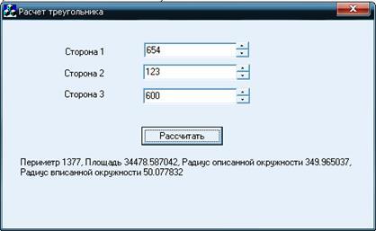 m_rsult. Frmt(«Периметр % d, Площадь % f, Радиус описанной окружности % f, Радиус вписанной окружности % f», rimtr, s, R_, R_V);
