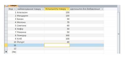 - Товари – код товару (ключове поле), найменування товару, кількість товару.