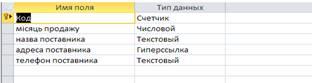 - Постачальник – код поставника (ключове поле), назва поставника, адреса поставника, телефон поставника.