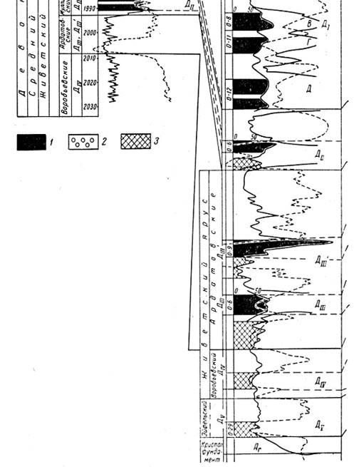 Нефтегазоносный комплекс терригенного девона включает следующие терригенные пласты: в эйфельском ярусе ДV и ДVI, в живетском ДIV, ДIIIи ДII , во франском ДI, Дk и Д0. Индексация выделяемых одновозрастных пластов не всегда совпадает в соседних регионах Волго-Уральской области. Даже в пределах одного региона на соседних площадях их аналоги иногда обозначаются различно.