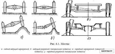 Неразрезные мосты представляют собой жесткие балки, связывающие правые и левые колеса (рис. 6.1, а). В автомобилях с независимой подвеской ведущий мост делают разрезным (рис. 6.1, б). Передний мост выполняют неразрезным при зависимой подвеске (рис. 6.1, в) или разрезным, если подвеска независимая (рис.6.1, г).