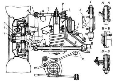 Разрезной передний мост устанавливают на легковых автомобилях. Он состоит из стойки, которая шарнирно соединена посредством шкворня с поворотным кулаком в средней части и шарнирно соединяется посредством верхнего и нижнего рычагов с балкой переднего моста. Для обеспечения стабилизации управляемых колес оси шкворней наклонены в продольной и поперечной плоскостях.