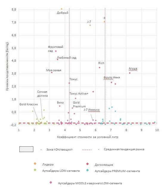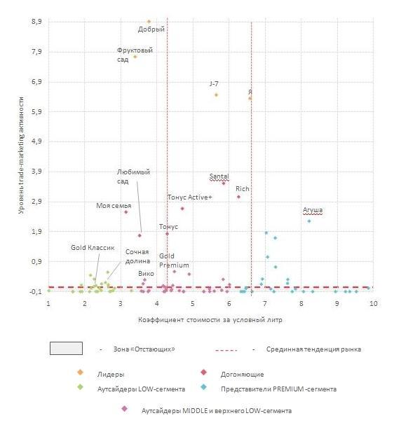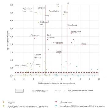 Рис 1. Ценовое позиционирование т/м — лидеров на рынке соков, нектаров и сокосодержащей продукции