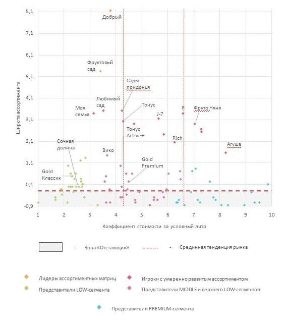 Одной из выявленных особенностей рынка соков стал крайне высокий разброс цен на продукцию (более 1500 руб. за усл. литр), что обусловило структуру сегментации, в которой нашлось место только трем сегментам — mass, super premium и extra premium-сегментами. В свою очередь к mass-сегменту относится более 80% всей представленной продукции в исследуемой категории, которую логично разбить на три ценовые ниши (low, middle и premium-сегменты). Очень важно, что даже среди основных игроков рынка практически нет брендов, ориентированных на конкретную целевую группу по ценовому признаку.