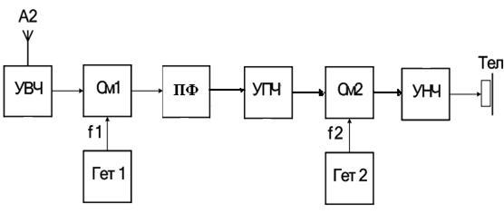 В приемном устройстве путем гетеродинирования осуществляется перенос спектра сигнала из высокочастотной области в область звуковых частот. С этой целью принятый А2 сигнал и усиленный в УВЧ подается на См1 вместе с частотой f2 от ГВЧ 1. После усиления в УПЧ однополосный сигнал подается на См2, в котором с помощью частоты f1 производится преобразование сигнала в область звуковых частот. Затем этот сигнал усиливается в УНЧ и выдается потребителям.