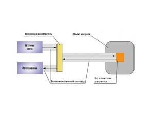 При изменении температуры изменяется период брэгговской решетки, а значит, изменяется и длина отражаемого излучения. Эти изменения в спектре отраженного света фиксирует фотоприемник, далее информация анализируется и определяется температура объекта контроля.