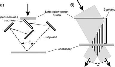 Часто для записи ВБР используют интерферометры с пространственным разделением пучка, которые имеют меньшее количество оптических элементов и, следовательно, большую временную стабильность. Такой интерферометр может быть создан, например, с использованием диэлектрического зеркала, которое делит фронт пучка на две равные части (интерферометр Ллойда, рис. 5б). Перестройка угла a в данном случае осуществляется путем поворота зеркала вместе с закрепленным на нем световодом, что значительно проще в сравнении с тем, как это делается в интерферометре, изображенном на рис. 5а. Отметим, что цилиндрическая линза, используемая в обеих схемах, представленных на рис. 5, служит для фокусировки излучения на волоконный световод (в ряде случаев на его сердцевину), что, как правило, необходимо для увеличения плотности УФ - излучения при записи брэгговских решеток.