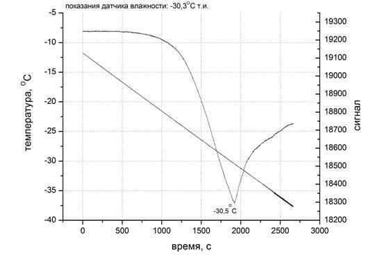 Перед каждой фазой эксперимента производился нагрев чувствительной части до 70°С с целью испарения остатков влаги из чувствительной области. Затем производилось медленное охлаждение детектора конденсата со скоростью 1°С/мин. При этом контролировался отражённый от скола волокна сигнал.