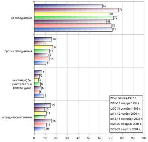 3. Представляется разумным также сосредоточить усилия на организации программ в поддержку идеи объединения двух государств. В России и Белоруссии набирают темпы процессы становления национального самосознания и самоидентификации. Как показывают социологические исследования, среди молодежи гораздо больше противников Союза, нежели среди лиц среднего и старшего поколения, и эта тенденция будет, скорее всего, с каждым годом усиливаться (см. Приложения 3 и 4). Разумеется, существенную роль играет и облик нынешнего режима России, с которым мало кто хочет объединяться.