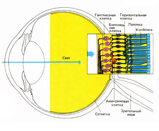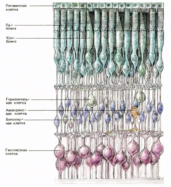 клеткам. Горизонтальные клетки соединяют рецепторы и биполярные клетки сравнительной длинными связями, идущими параллельно сетчаточным слоям; сходным образом амакриновые клетки связывают биполярные клетки с ганглиозными.