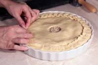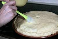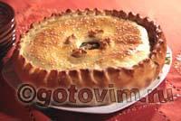 Разделить тесто на 2 части - большую и меньшую. Большую часть раскатать и уложить на дно смазанной маслом припудренной формы для пирога, при этом поднимая края пирога как можно выше. Выложить начинку. Меньшую оставшуюся часть теста раскатать в круг и уложить поверх начинки.