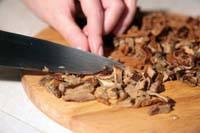Муку (2 стакана) просеять, добавить соль, сахар (1/2-1 ст.л.) и яйца. Для опары в слегка подогретом молоке развести дрожжи с 1 ст. ложкой муки, 1 ч. ложкой сахара и поставить в теплое место. Когда дрожжи начнут работать (пузыриться), влить их в миску с мукой. Тесто хорошо вымесить и поставить емкость с тестом в теплое место (можно в таз с горячей водой), чтобы тесто подошло. После того как тесто увеличиться в объеме в 2-3 раза, вымесить его. Повторить эту процедуру 2-3 раза, после чего выложить тесто на посыпанный мукой стол и хорошенько вымесить тесто, добавляя при необходимости муку. Для начинки грибы залить теплой водой, оставить на час. Слить воду, отжать грибы и мелко порезать. Куриное мясо мелко нарезать (1х1 см).
