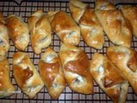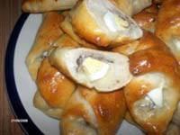 Дрожжевое тесто из хлебопечки. Раскатать, разрезать на квадраты. На каждый квадрат по диагонали положить филе кильки пряного посола и 1/6 яйца. Сложить 2 противоположных конца квадратов и заколоть деревянной шпилькой. Выпекать в духовке до готовности.