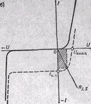 Схема (а), поясняющая принцип действия фотогальванического элемента, и его вольт-амперная характеристика (б).