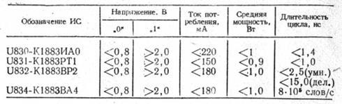 В состав МПК U83-K1883 входят четыре микросхемы высокой степени интеграции, выполненные в керамических корпусах с 48 выводами; МПК следует использовать в диапазоне температур от О до 70°С (в нерабочем состоянии от — 60 до 125° С). Питание всех схем МПК осуществляется от одного источника (+5 В ±5%), их электрические параметры приведены в табл. 1.