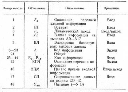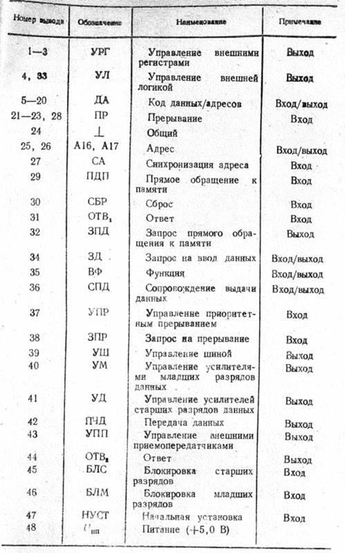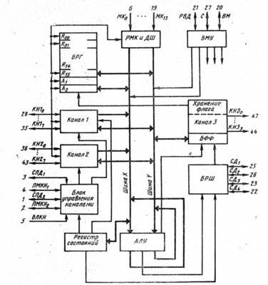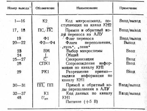 Сигналы сопровождения данных (СПД), приема данных по каналу (ПМК), разрешения выдачи (РВД), синхронизации канала входа (С) и выбора микросхемы (ВМ) служат для синхронизации работы схемы и для разрешения ввода и вывода данных. Кроме того сигнал ВЫБОР МИКРОСХЕМЫ служит для выбора прибора. Через вход БЛКН может быть подана команда о прямом обращении к памяти. Входы СД1—СД4 предназначены для объединения схем АУ для обработки многоразрядных слов (16, 24, 32 разряда). Содержание флагового регистра блока формирования флага может быть выдано по каналу 3.
