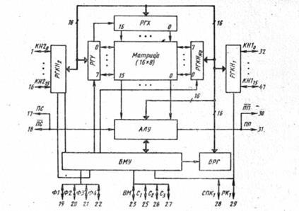 Матрица, представляющая собой поле из 16X8 сумматоров, соединенных по схеме умножения, предназначена для выполнения операции умножения 16-разрядного операнда, поступающего на регистр РГХ, и 8-разрядного операнда, поступающего на РГУ. Результат умножения размещается в регистре РГИ или поступает на вход АЛУ. АЛУ выполняет арифметические и логические операции, код которых поступает по каналу К2 на регистр РГК2. Прием операндов и выдача результатов осуществляется по каналу К1 через РГК1.