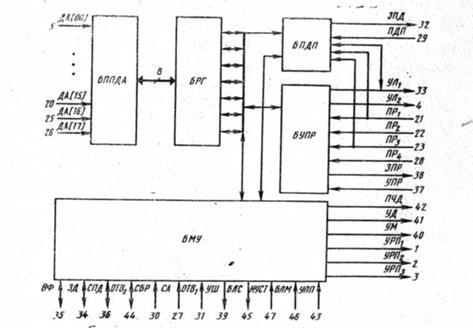 БИС МА размещена в корпусе из 48 выводов, назначение каждого приведено в табл. 5. Структурная схема БИС МА приведена на рис. 7. МА включает в себя блок регистров (БРГ), блок местного управления (БМУ), блок управления прерываниями (БУПР), блок прямого доступа к памяти (БПДП) и блок приемопередатчиков адресов и данных (БППДА). БМУ осуществляет внутреннюю синхронизацию БИС МА, управляя работой как отдельных блоков, так и внутренней шины.