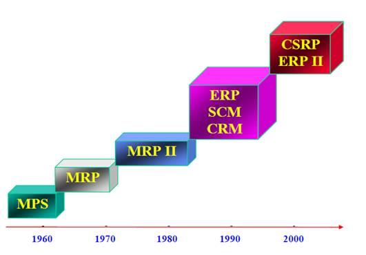 В 60-е годы началось использование вычислительной техники для автоматизации различных областей деятельности предприятий. Тогда же появился класс систем планирования потребностей в материалах (MRP - Material Requirements Planning). В основе функционирования подобных систем лежало понятие спецификации изделия (BOM - Bill Of Materials) и производственной программы (MPS- Master Production Schedule). Спецификация показывало готовое изделие в разрезе входящих в него компонентов. Производственная программа содержала информацию о временном промежутке, виде и количестве готовых изделий, запланированных к выпуску предприятием. При помощи BOM и MPS происходила процедура разузлования спецификации, на основании чего, предприятие получало информацию о потребностях в материалах для производства необходимого количества готовых изделий в соответствии с MPS. Затем, информация о потребностях преобразовывалась в серию заказов на закупку и производство. Также, в данном процессе учитывалась информация об остатках сырья и материалов на складах.