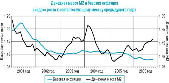 Рис. 1. Денежная масса М2 и базовая инфляция в 2001-2006 г.