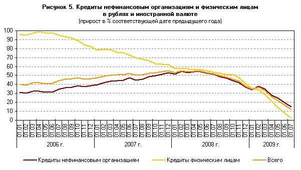 Во II квартале 2009 г. происходило дальнейшее снижение годовых темпов прироста кредитов экономике, обусловленное сохраняющейся высокой стоимостью заимствований на внутреннем рынке, а также снижением спроса на кредиты в условиях общего спада экономической активности. Значительное уменьшение темпов роста депозитной базы, а также продолжающееся сокращение поступлений средств, привлекаемых на международных финансовых рынках, существенно ограничивали предложение кредитов со стороны российской банковской системы. Во II квартале 2009 г. продолжился рост просроченной задолженности по кредитам нефинансовым организациям и населению, что стало дополнительным фактором, обусловившим ограничение предложения кредитов.