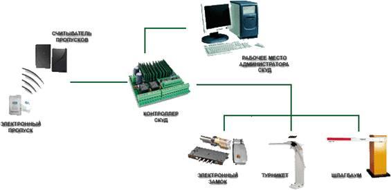 Контроллерные СКУД. Первоначально СКУД появились в зарубежных странах, которые пошли по пути создания именно контроллерных систем. Связано это было, в первую очередь, с тем, что в то время просто не существовало программных средств, которые бы предоставляли возможности для создания подобного рода систем. Появившиеся в конце XX века в России, СКУД российского производства во многом повторили ход развития своих западных аналогов. Этим и объясняется широкая распространенность именно контроллерных СКУД на территории Российской Федерации. Контроллерная СКУД – это совокупность аппаратных, программно-технических средств и организационно-методических мероприятий, с помощью которых решается задача контроля и управления посещением отдельных помещений, а также оперативный контроль перемещения персонала и времени его нахождения на территории объекта. При их действительном многообразии все они работают по единой схеме: оборудование (запорно-пропускной механизм, будь то турникет, шлагбаум, проходная кабина и любое другое управляемое преграждающее устройство, а также считыватели - устройство, предназначенное для считывания (ввода) идентификационных признаков и др.) подключается к контроллеру, который в свою очередь подсоединяется к компьютеру. Схематично модель контроллерной СКУД можно представить следующим образом: