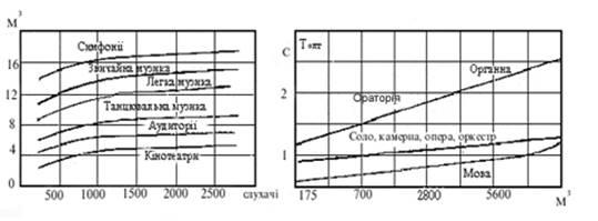 При расчете объемов и геометрических размеров необходимо учитывать рекомендуемые объемы, приходящиеся на одного зрителя, которые могут быть определены из графиков, приведенных на рис.1.
