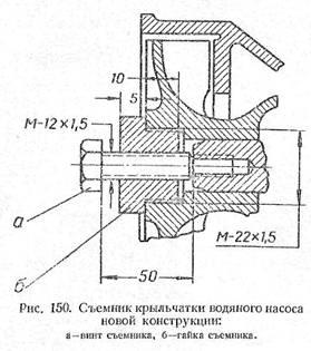 3) завернуть в крыльчатку гайку съемника б (рис. 150) и, вращая винт съемника а, спрессовать крыльчатку вместе с сальником;