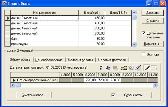 Для занесения данных необходимо выбрать директорию «Операционный план». В ней необходимо открыть окно «План сбыта», где существует возможность планирования графика сбыта и цены продукции, как показано на рисунке №2. Чтобы смоделировать ее в программе, необходимо ввести список продуктов и предлагаемый объем его продаж. Система позволяет учесть дополнительную информацию о влиянии сезонности на цену, задать схему, по которой будет формироваться цена того или иного продукта на протяжении всего проекта. В процессе разработки стратегии продаж в Project Expert учитываются факторы времени, такие, как: время реализации продукта (услуги), время задержки платежа после поставки продукции, а также условия оплаты продукта ил услуги потребителя (по факту, с предоплатой или в кредит).