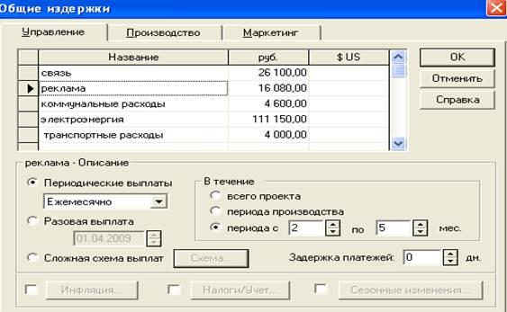 Система позволяет описать график производства и различные виды издержек, связав сложной математической зависимостью выбранные параметры финансовой модели предприятия, например, при моделировании объема производства продукта, исходя из возможностей предприятия и прогнозной емкости рынка. Затраты ООО «Рио» можно проследить на рисунке №4.